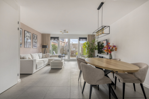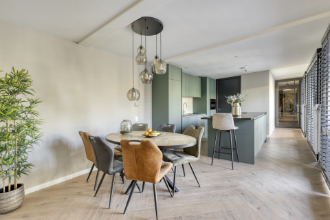 De woonkamer is heerlijk ruim en strekt zich uit over de volledige breedte van de woning, met een oppervlakte van 23,10 m². Dankzij de grote ramen in de zij- en achtergevel is er veel lichtinval. Mocht het iets te warm worden zijn er screens aanwezig. Super handig om de warmte buiten te houden, maar het daglicht toch binnen te laten. Hier is volop ruimte voor een royale eettafel met zes stoelen en een grote hoekbank met tv-meubel. De vloer is afgewerkt met een stijlvol laminaat met hoge witte plinten. De strakke afwerking van de muren en het plafond zorgt voor een moderne uitstraling. Het plafond is bovendien voorzien van inbouwspots, wat het geheel een extra luxe uitstraling geeft.